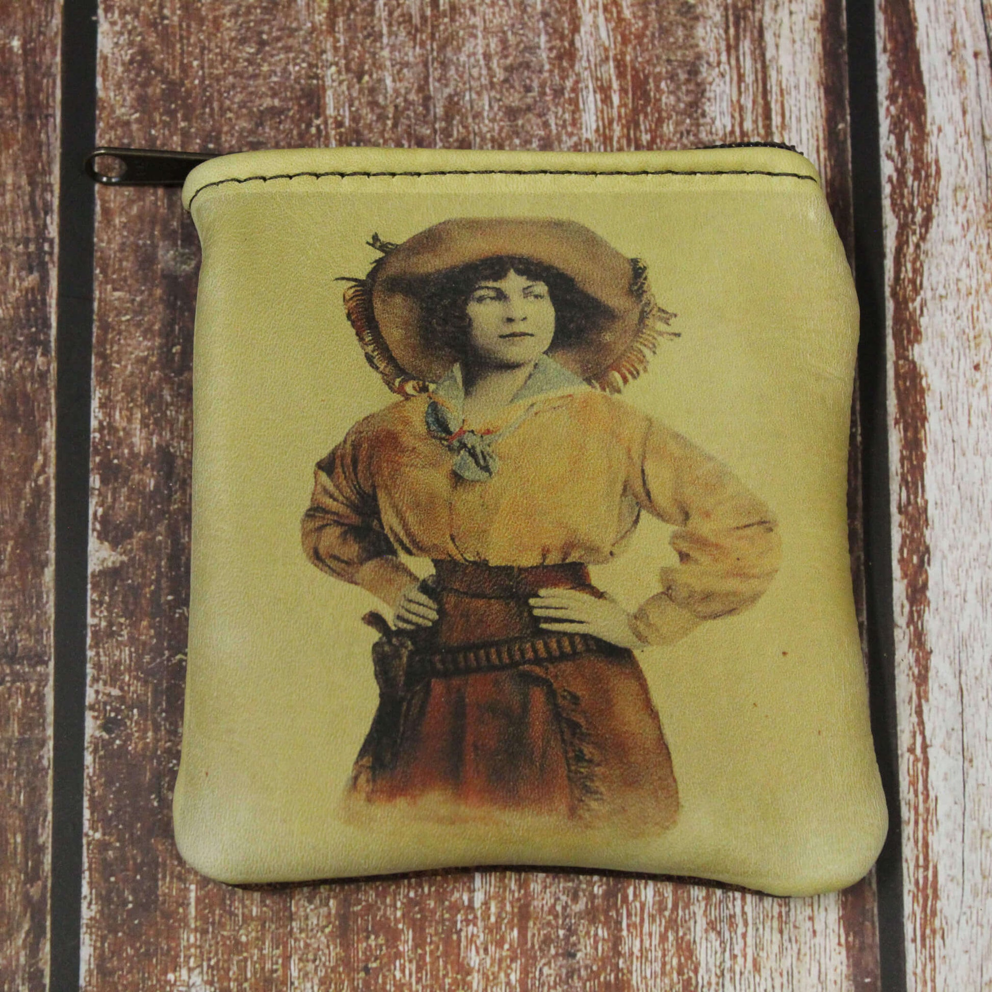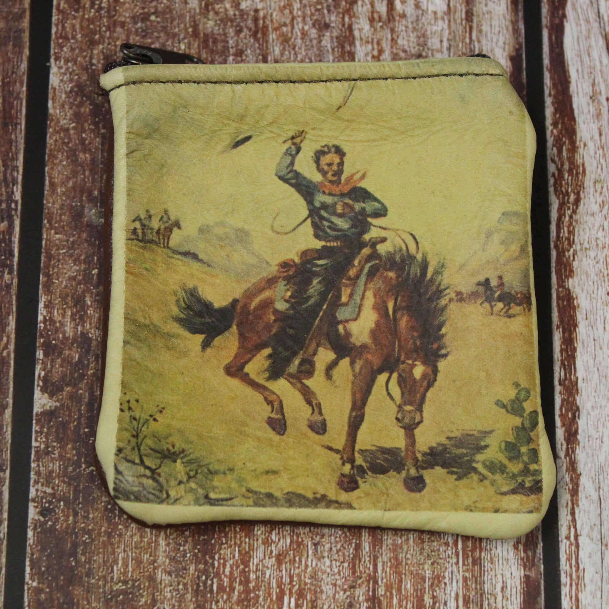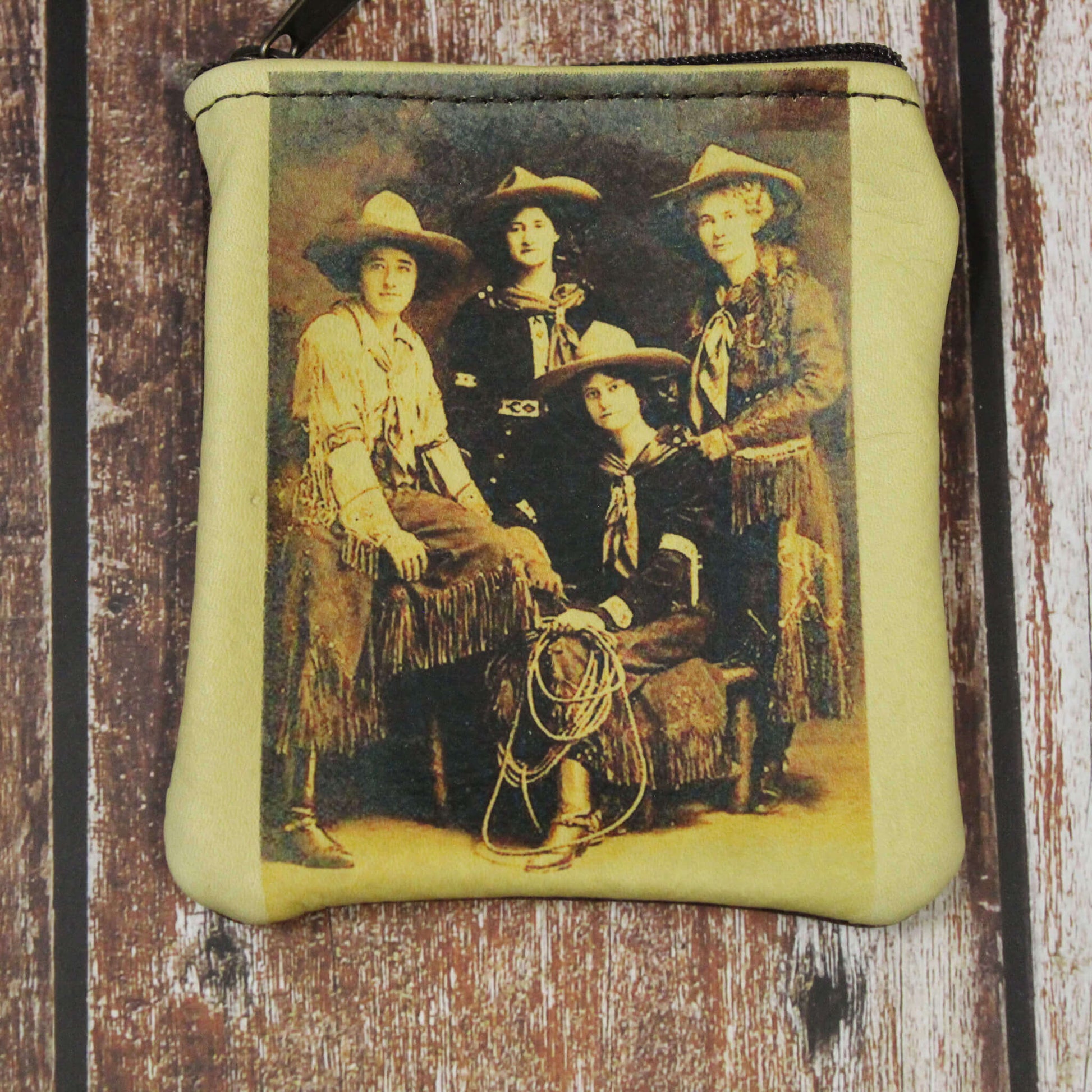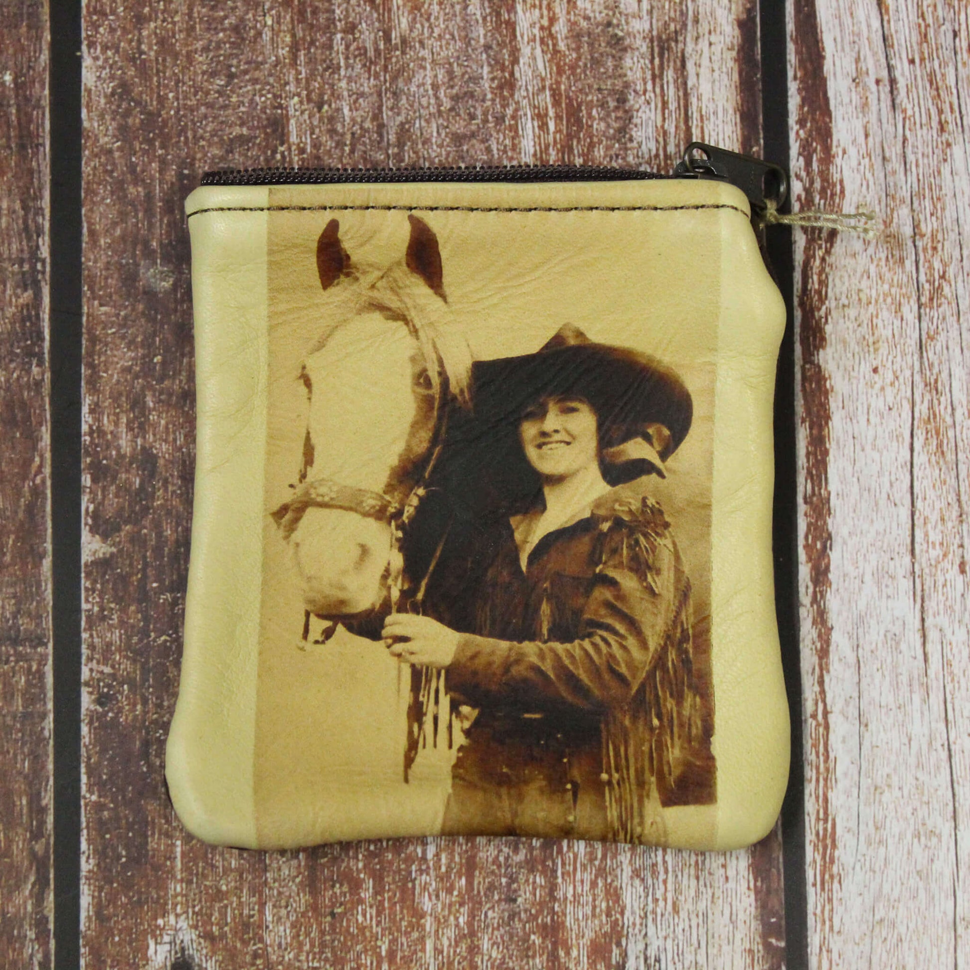 A great little organizer you’ll want with you everywhere you go. Made of soft leather and measures 4” x 4-½” in vintage cowgirl prints with zipper closure. Images may vary in color and size.