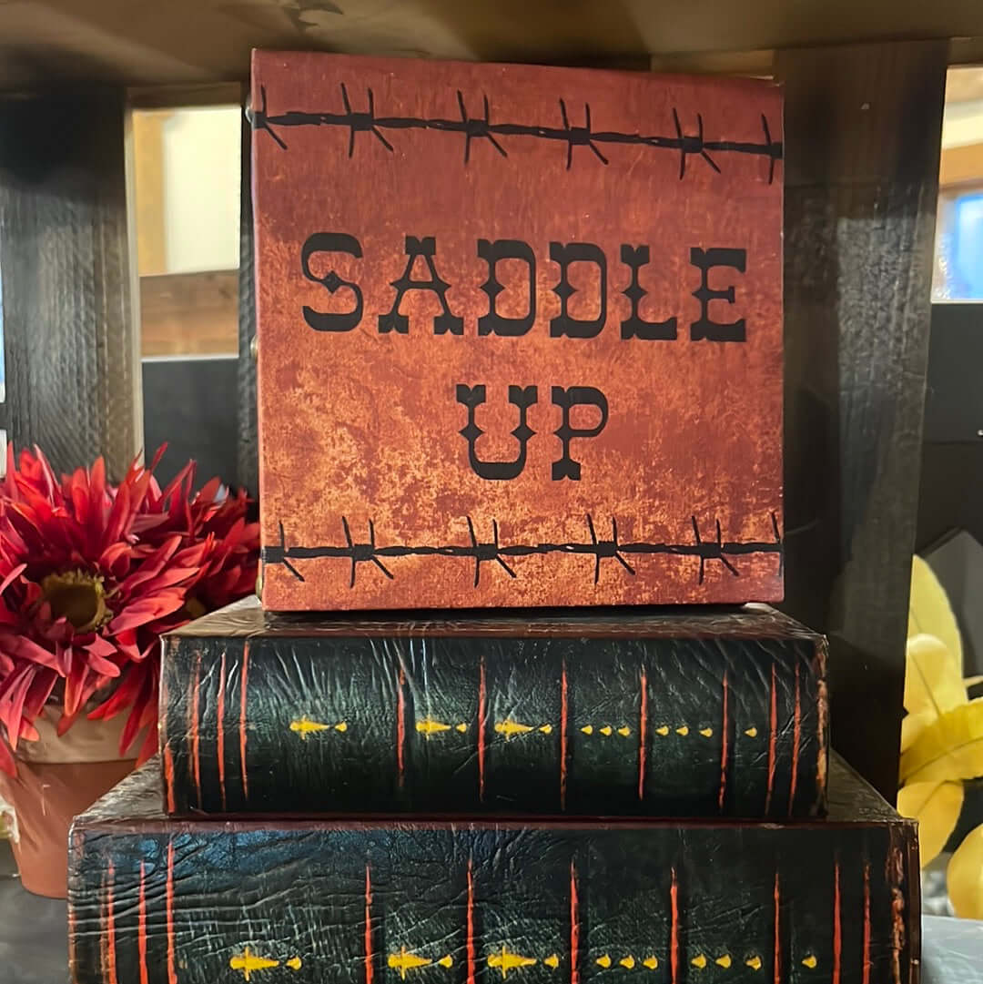 Showcase your love of the wild west with this stylish Knick knack. The custom distressed font spells out "Saddle Up" for a playful nod to cowboys and rodeos. Small enough to sit on a shelf or hang on the wall, this sign adds a dash of country charm to living rooms, bedrooms, offices, and more. Measures 5-3/4" x 5-3/4" x 2"